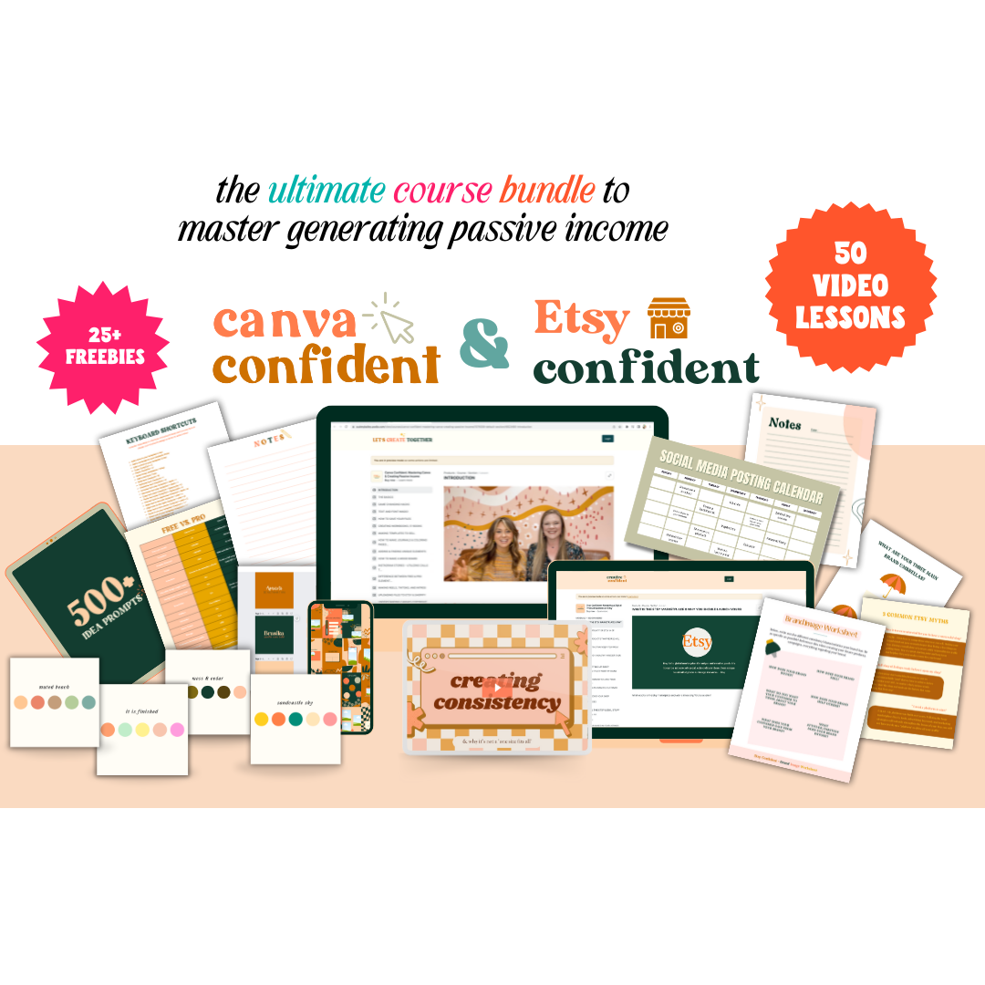 Our 2 most popular courses, Canva Confident and Etsy Confident, bundled together by popular demand! By purchasing this bundle, you will have INSTANT access to 50+ video lessons, 50+ freebies, and lifetime access to the content, current and new, in your own student portal. Complete at your own pace! This is the BEST price for both Canva Confident and Etsy Confident.